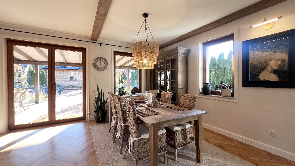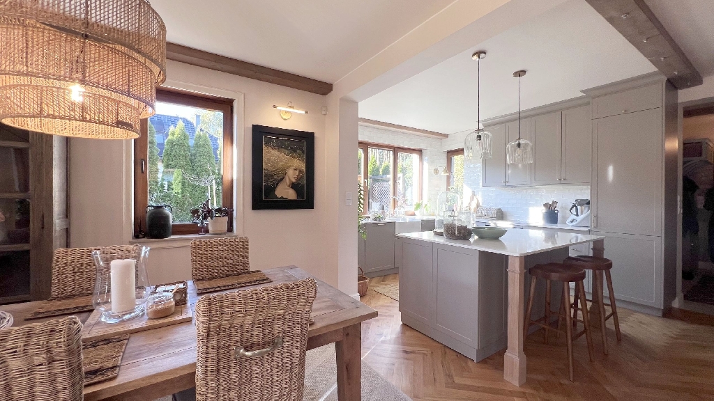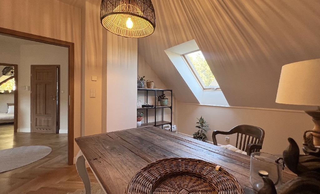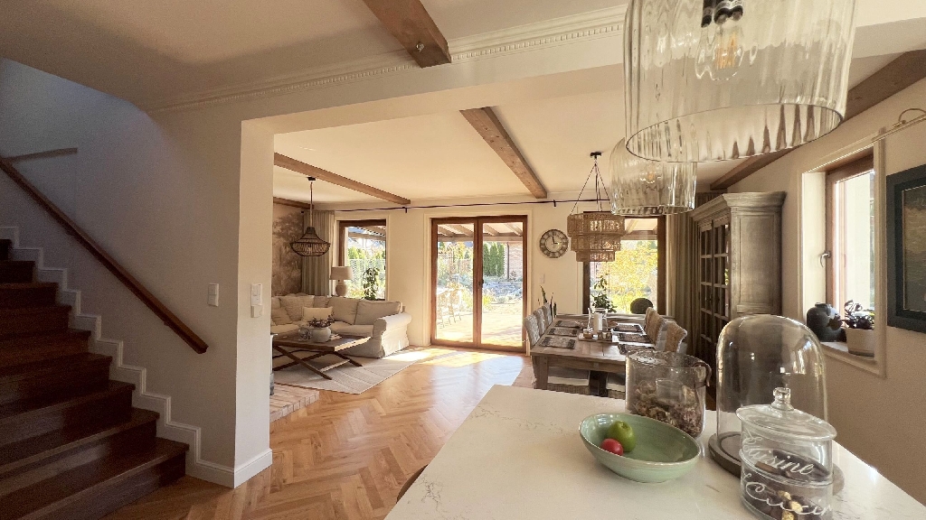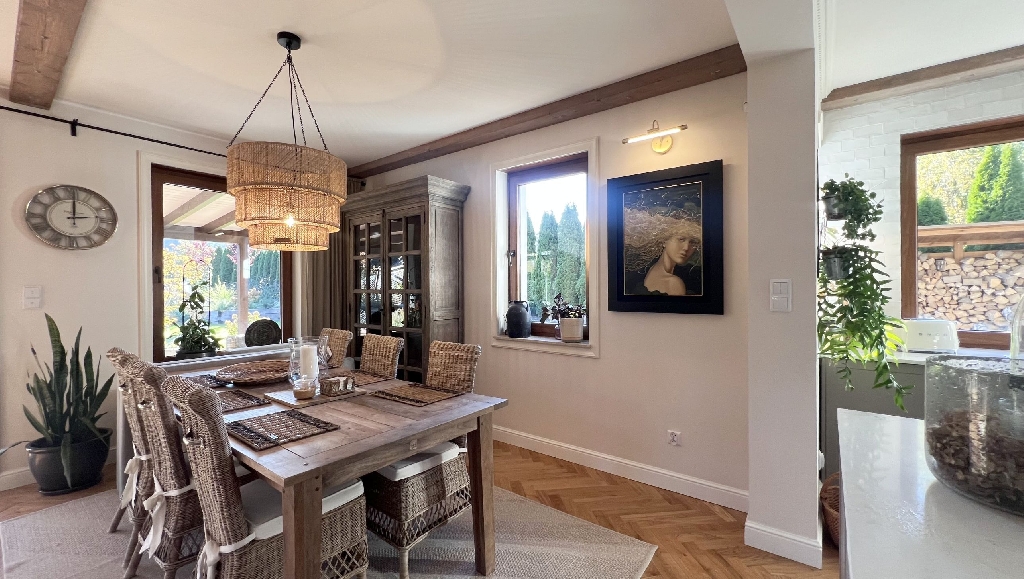 Klimatyczny dom jednorodzinny + mniejszy domek dla gości, na biuro, studio, gabinet itp. Oferta wyłącznie w biurze "Rodzinne Nieruchomości" Z przyjemnością prezentuję fantastyczny dom jednorodzinny o całkowitej powierzchni 197,71 m2, mieszkalnej 131,46, z garażem w bryle budynku, na pięknie zagospodarowanej, ogrodzonej działce o powierzchni 989 m2. Część mieszkalna zajmuje zarówno parter, jak i całe poddasze, nad którym znajduje się niewielki stryszek. Każda kondygnacja posiada osobną łazienkę z wc, obie z oknem. Parter to przede wszystkim przestronny salon z otwartą kuchnią, holl, wiatrołap, łazienka wyposażona w kabinę prysznicową oraz wc, ponadto garaż jednostanowiskowy. Z salonu mamy wyjście na przestronny zadaszony taras wyłożony deską, stąd dostaniemy się na teren ogrodu. Na wyższej kondygnacji znajduje się hol, 4 sypialnie i łazienka z wanną i z wc. Klatka schodowa jest szeroka i wygodna, schody wykończone deską. Kuchnia została umeblowana i wyposażona pod wymiar. Gustownie urządzony salon urozmaica kominek. Podłogi na obu kondygnacjach wyłożone zostały wysokiej jakości deską, a wnętrze od progu zachęca naturalnymi kojacymi kolorami oraz niecodziennym klimatem. Do pomieszczeń z każdej strony wpada światło dzienne, a widoki z okien, niczym obrazy malowane pędzlem artysty, zapewnia wszechobecna zieleń widoczna z każdej strony zarówno z ogrodu, jak i z lasu obok domu. Położenie nieruchomości to ogromny atut tego miejsca. Takie otoczenie w połączeniu z nietuzinkowym klimatem domu czyni tę nieruchomość niepowtarzalną. Budynek został wyposażony w odkurzacz centralny, a także w filtry oczyszczające wodę. Wszystkie okna zabezpieczone są roletami zewnętrznymi sterowanymi automatycznie. Ogrzewanie domu - pompa ciepła. Na terenie posesji po przeciwnej stronie działki znajduje się drugi dom, 35 metrowy, wyposażony w kominek. Budynek ten jest ocieplony, z elewacją z prawdziwej cegły, dach pokryty blachodachówką, doprowadzone są do niego wszystkie instalacje. Działka posiada 2 wyjścia, jedno od strony głównego wjazdu, drugie - po przeciwnej stronie za mniejszym domkiem. Dzięki takiemu rozwiązaniu w tym mniejszym budynku z powodzeniem można urządzić sobie biuro, studio, gabinet itp z niezależnym wyjściem na ulicę. Idealnie sprawdzi się też jako lokum dla rodzica, który chciałby mieszkać blisko dzieci czy wnuków. Teren wokół obsadzony jest tujami, co zapewnia prywatność. Ogrodzenie stanowi siatka modułowa. Ogród został starannie zaplanowany, do każdej strefy na działce prowadzą wyłożone cegłą ścieżki. W kilku miejscach umieszczone zostały pergole dające wsparcie pnącym się kwiatom. Od strony bramy wjazdowej sterowanej automatycznie mamy wybrukowany podjazd do garażu oraz drugi prowadzący pod wiatę obok budynku. Nieruchomość położona jest na kameralnym osiedlu domów jednorodzinnych "Leśna Kraina" realizowanym przez firmę "TomBud". Wokół cisza i spokój, tylko odgłosy natury, zapach lasu i śpiew ptaków. Dojazd do centrum Obrowa zajmuje 5 minut. Mamy tu urząd gminy, szkołę, przedszkole, markety, sklepy, punkty usługowe, przychodnię lekarska, weterynarza, kościół, restaurację, przystanek PKS i MZK. Dojazd do Torunia możliwy jest dwiema trasami: przez Lubicz lub przez Osiek nad Wisłą i Złotorię. Odległość od Torunia: około 20 km. Nieruchomość może być wolna w krótkim terminie. Księga wieczysta bez jakichkolwiek obciążeń. Gorąco polecam tę nieruchomość i zapraszam na prezentację - do zobaczenia :) Kontakt: Beata Kamińska tel. 601 673 337 Pośrednik w obrocie nieruchomościami nr licencji 22622 OFERUJEMY UBEZPIECZENIE PAŃSTWA NIERUCHOMOŚCI ORAZ UBEZPIECZENIE NA ŻYCIE W BARDZO SZEROKIM ZAKRESIE ZAPEWNIAMY WSPARCIE DOŚWIADCZONEGO NIEZALEŻNEGO DORADCY KREDYTOWEGO Niniejsze ogłoszenie nie stanowi oferty w rozumieniu przepisów Kodeksu Cywilnego i ma charakter informacyjny. Powyższe informacje zostały sporządzone na podstawie oświadczeń i są prawdziwe wg wszelkiej wiedzy i starania. Przestrzegamy regulaminów serwisów nieruchomościowych i nie publikujemy celowo nieaktualnych ofert. |